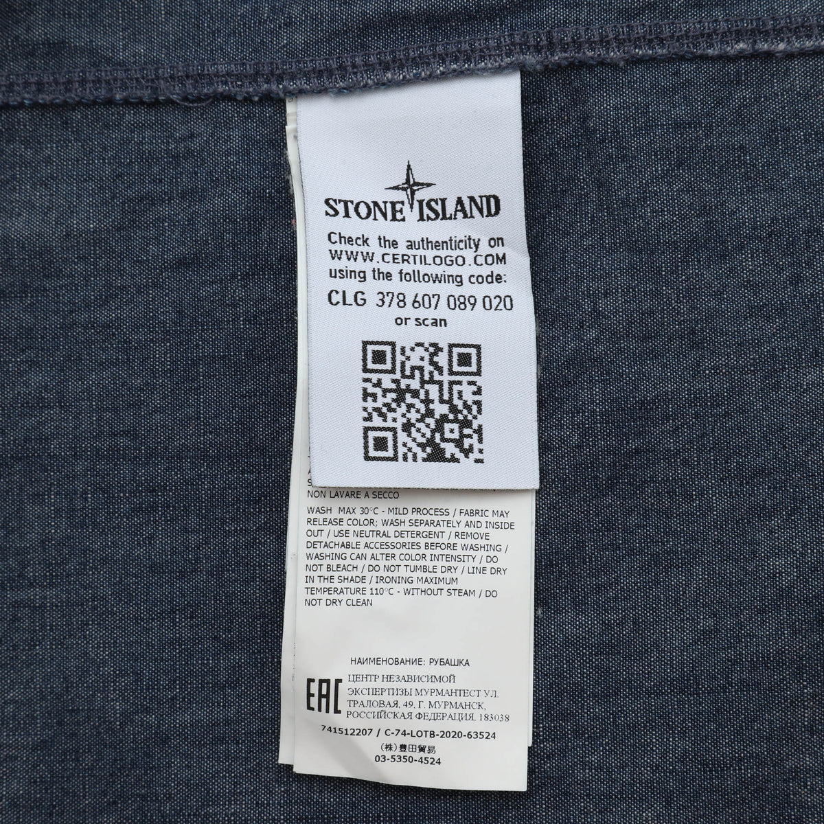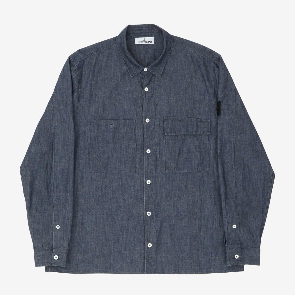 Logo Detail Denim Shirt by Stone Island. Pocket button missing, as pictured.