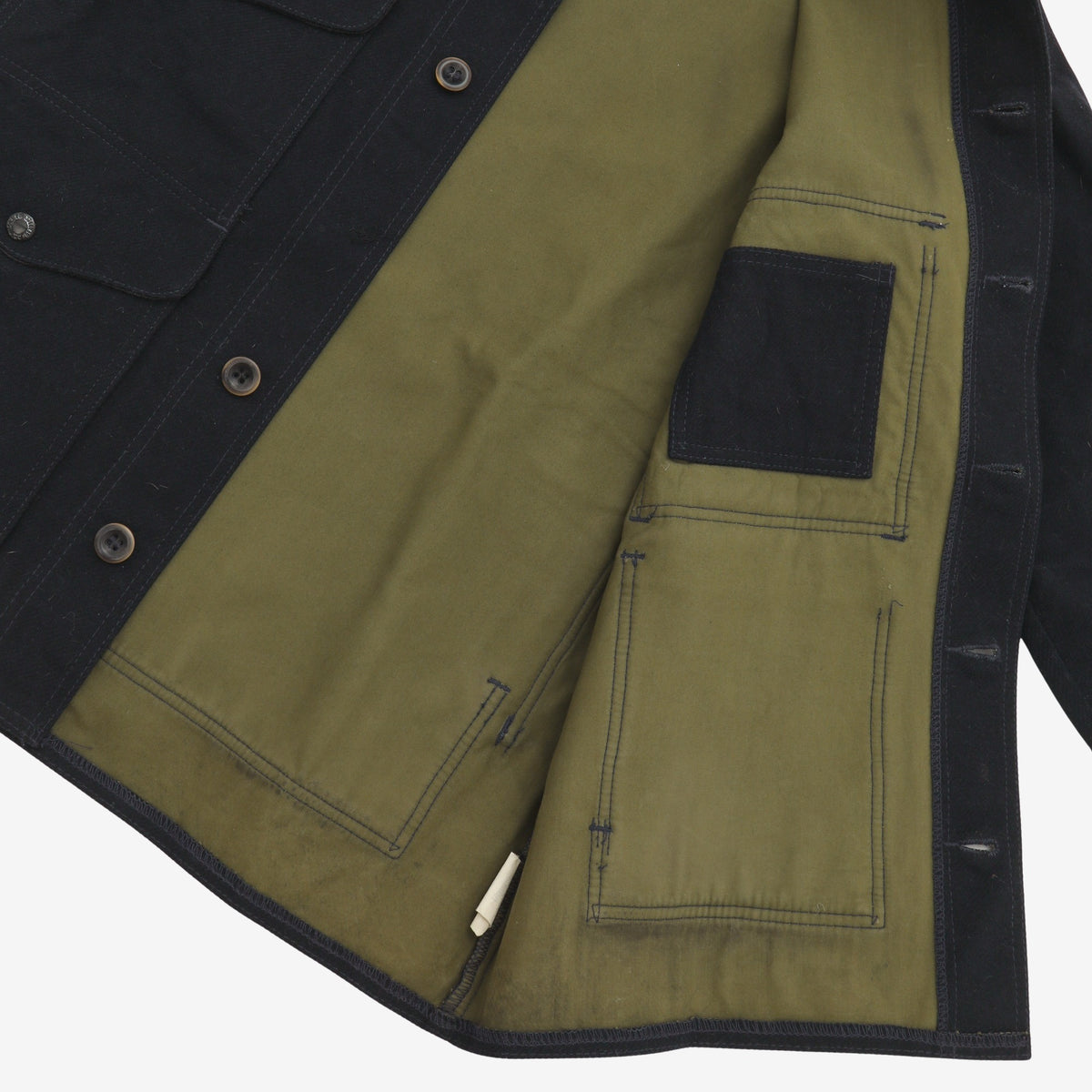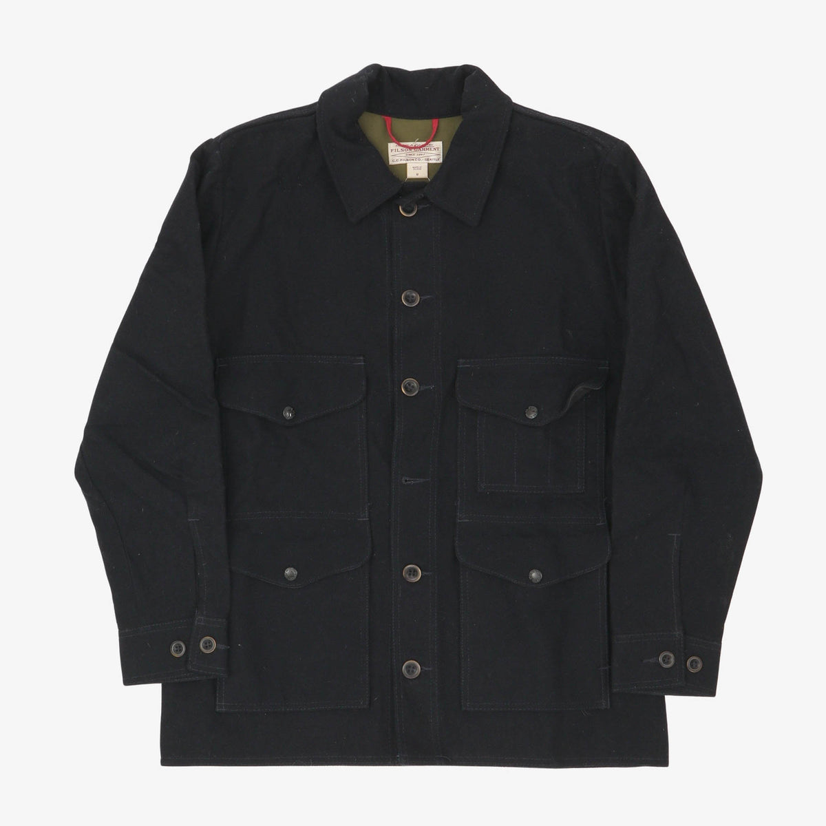 Mackinaw Wool Cruiser Jacket by Filson. Middle button missing and light wear throughout, as pictured.