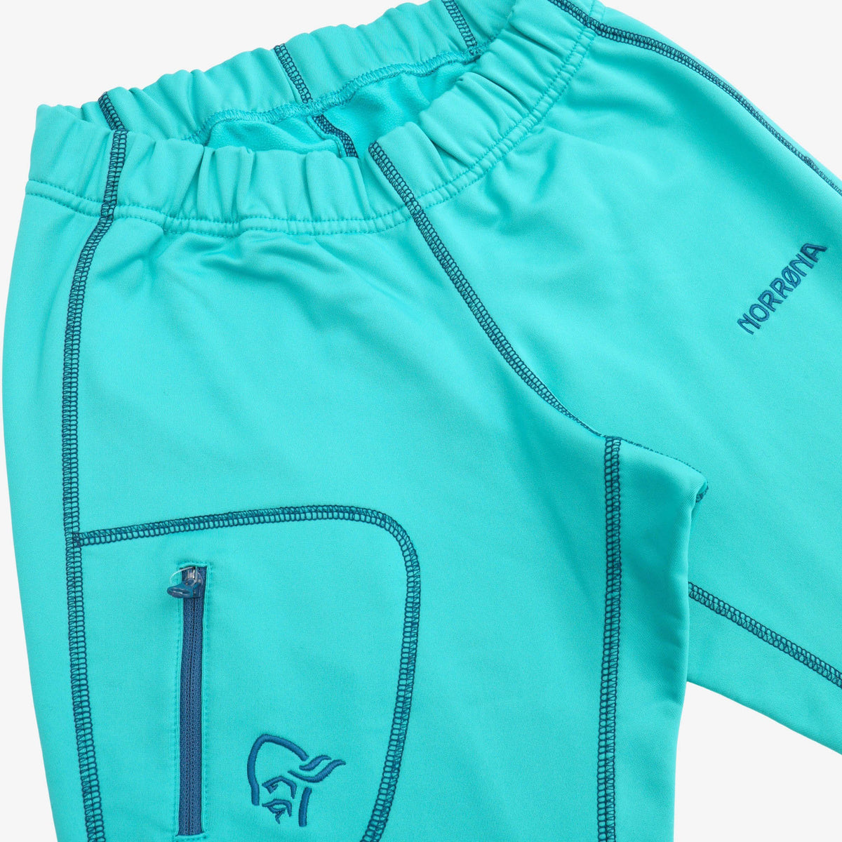 Trollveggen Warm2 Stretch Fleece Tights by Norrona. Some loose stitching just below waistband at the back, as shown in images.