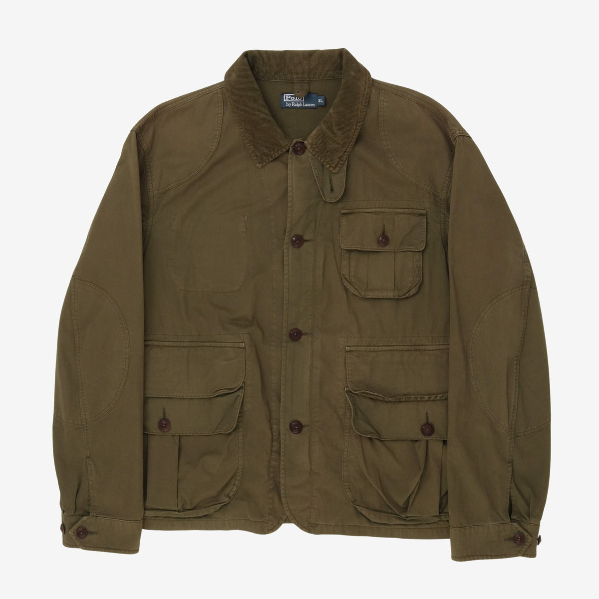 An iconic jacket from Ralph Lauren’s Sportsman range of outerwear. Khaki green colourway. Features a contrast corduroy collar and multiple utility cargo pockets.