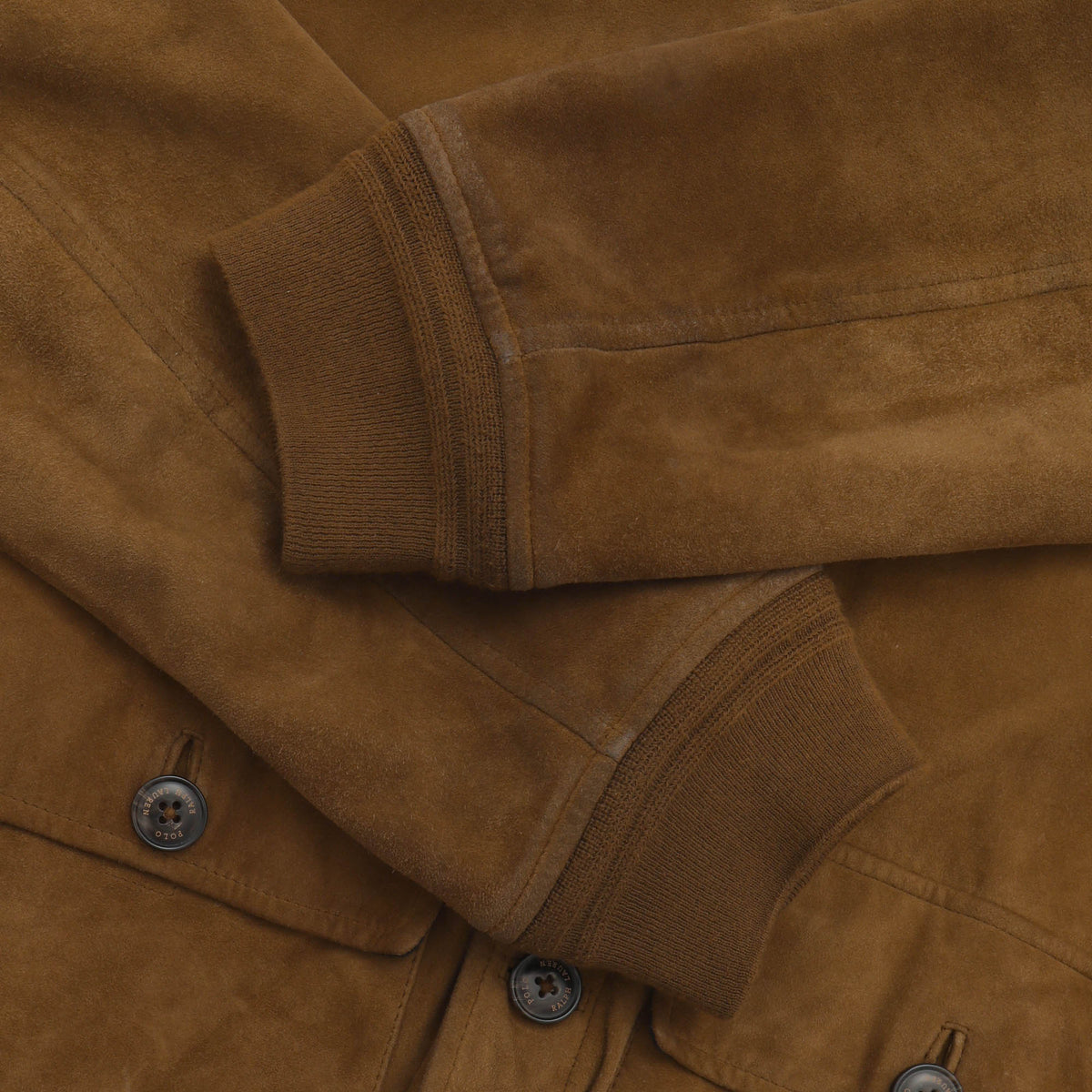 Suede Bomber Jacket by Polo Ralph Lauren. Some light marks and discolouration around the cuffs. Size label has been removed, please refer to the size guide for measurements.
