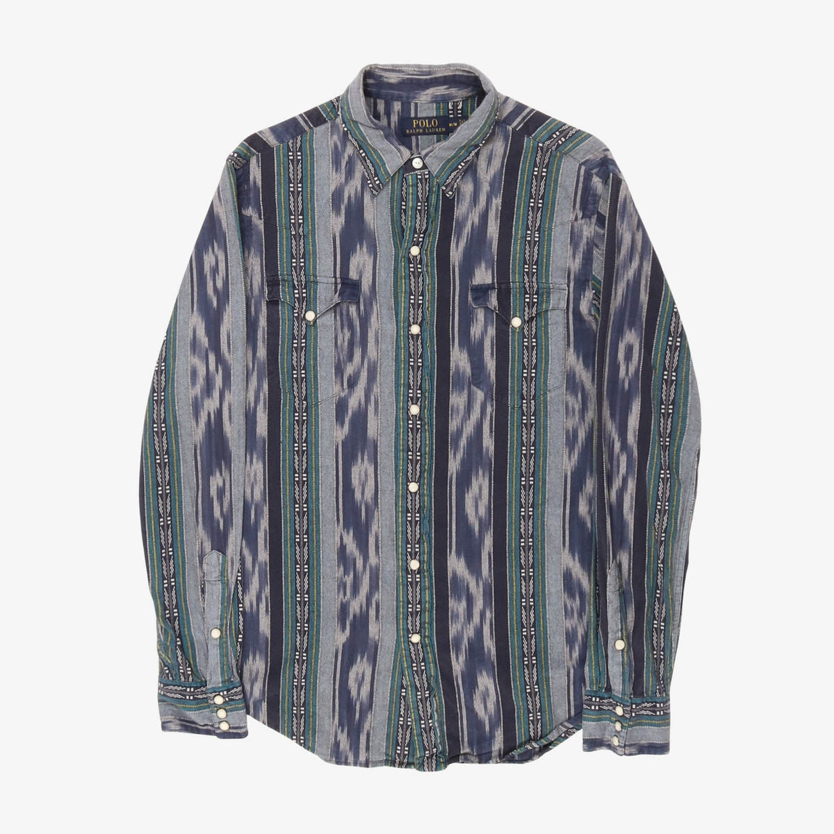 Ralph Lauren is known for its amazing Aztec and Navajo pattern shirts. This one comes in a blue colour-way and a really high quality cotton material. Has pop pearl buttons. A wardrobe staple.